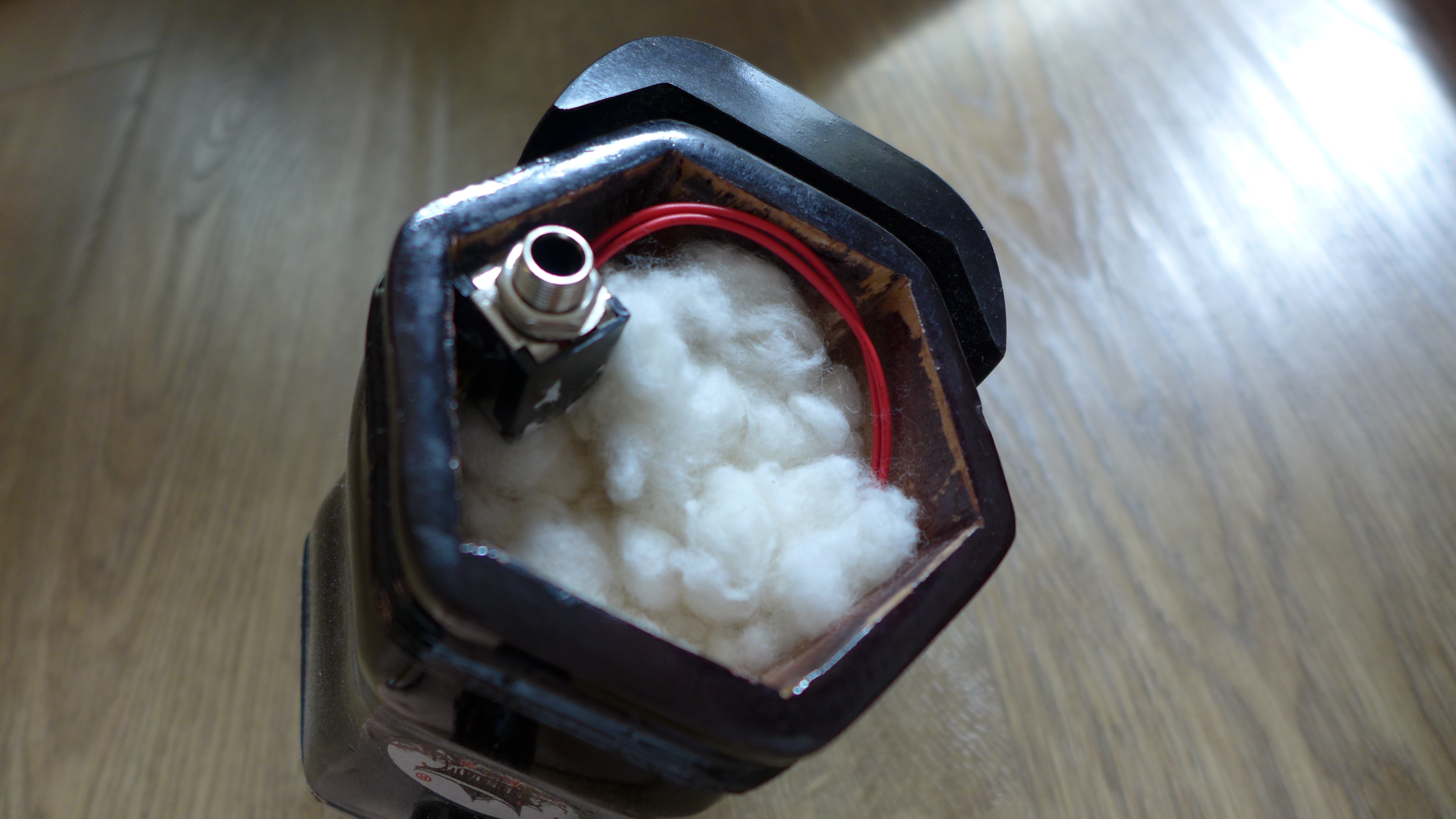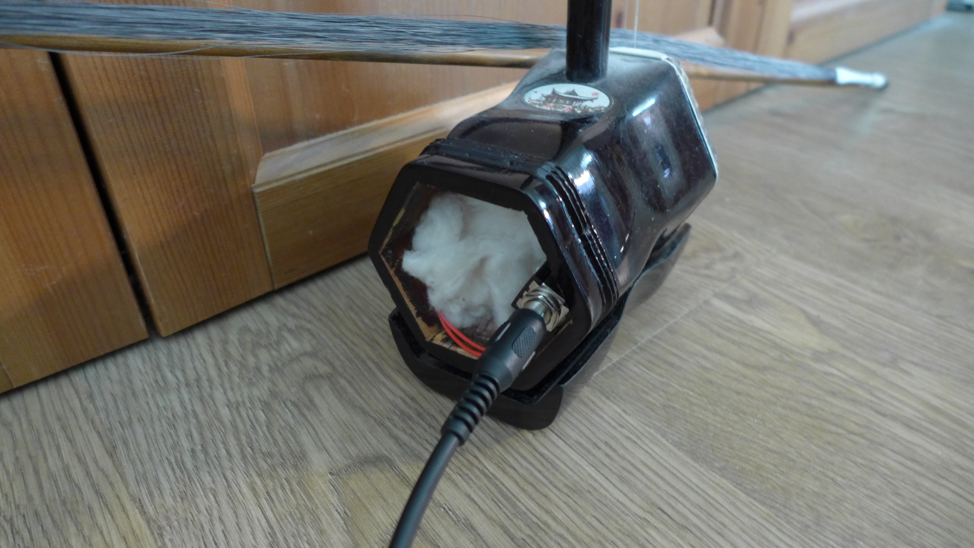 現在基本上這電二胡已經能運作了,但是還有一點重要的沒做,那就是把原本二胡的聲音去掉,在這部分我用的是棉花,把音箱填滿來吸收部分的聲音。