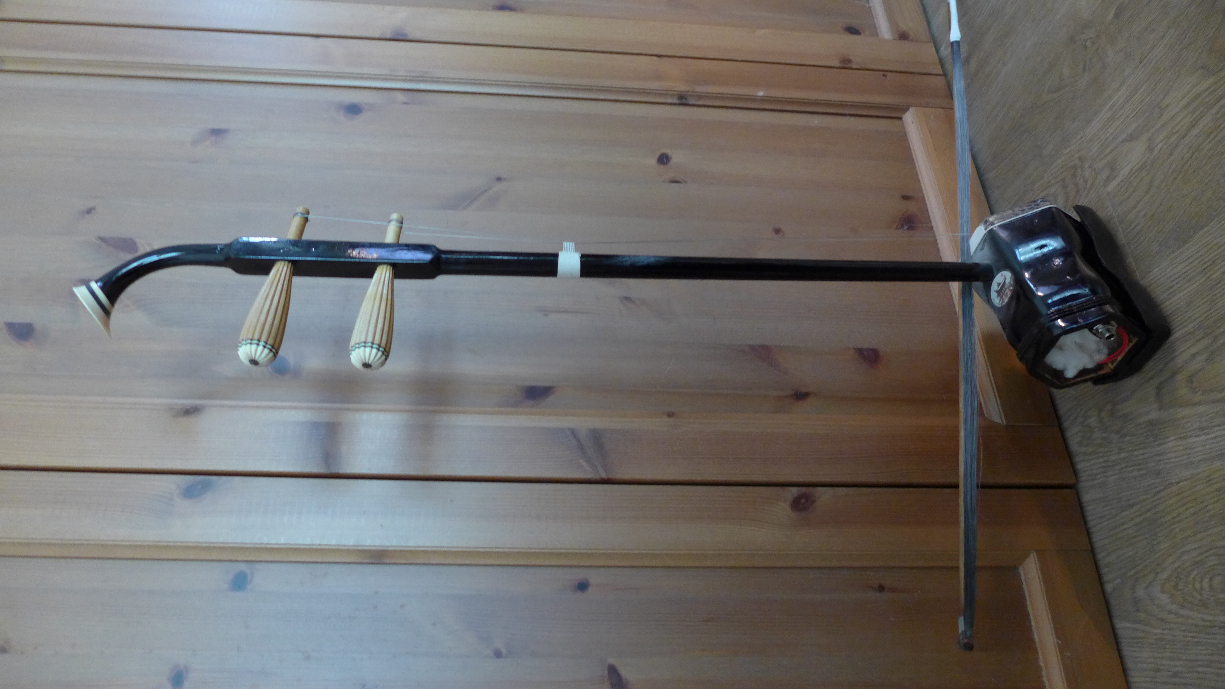 我的目標是要把這把二胡改裝成電二胡,並且把原本的聲音去掉,再把輸出訊號接到效果器做出像電吉他那種聲音。