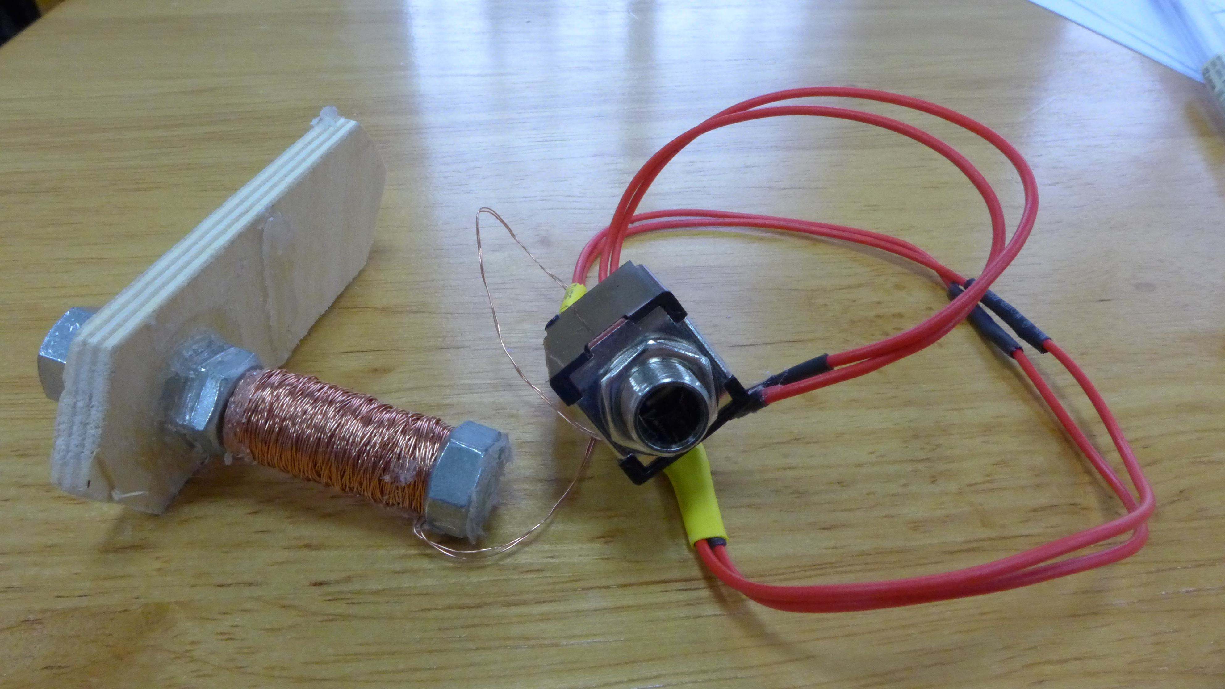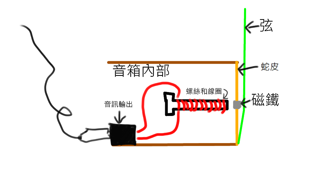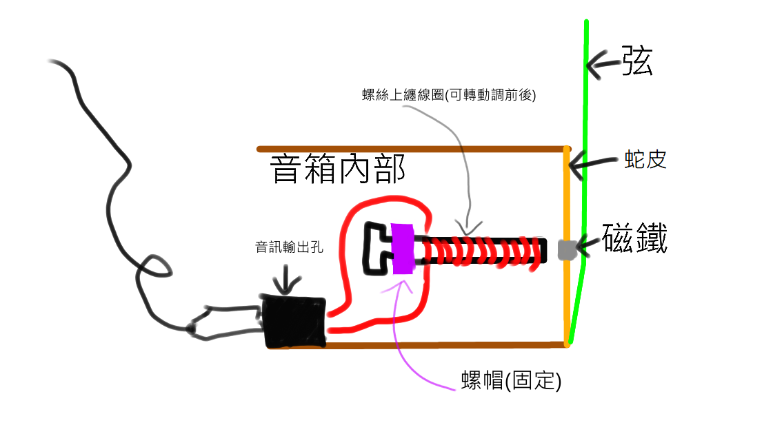 後來決定使用類似喇叭的結構(我不考慮麥克風,很容易收到環境雜音),把磁鐵黏在蛇皮上,再用繞了線圈的螺絲靠近磁鐵,弦震動時蛇皮也會帶動磁鐵震動,線圈就會感應到電流。