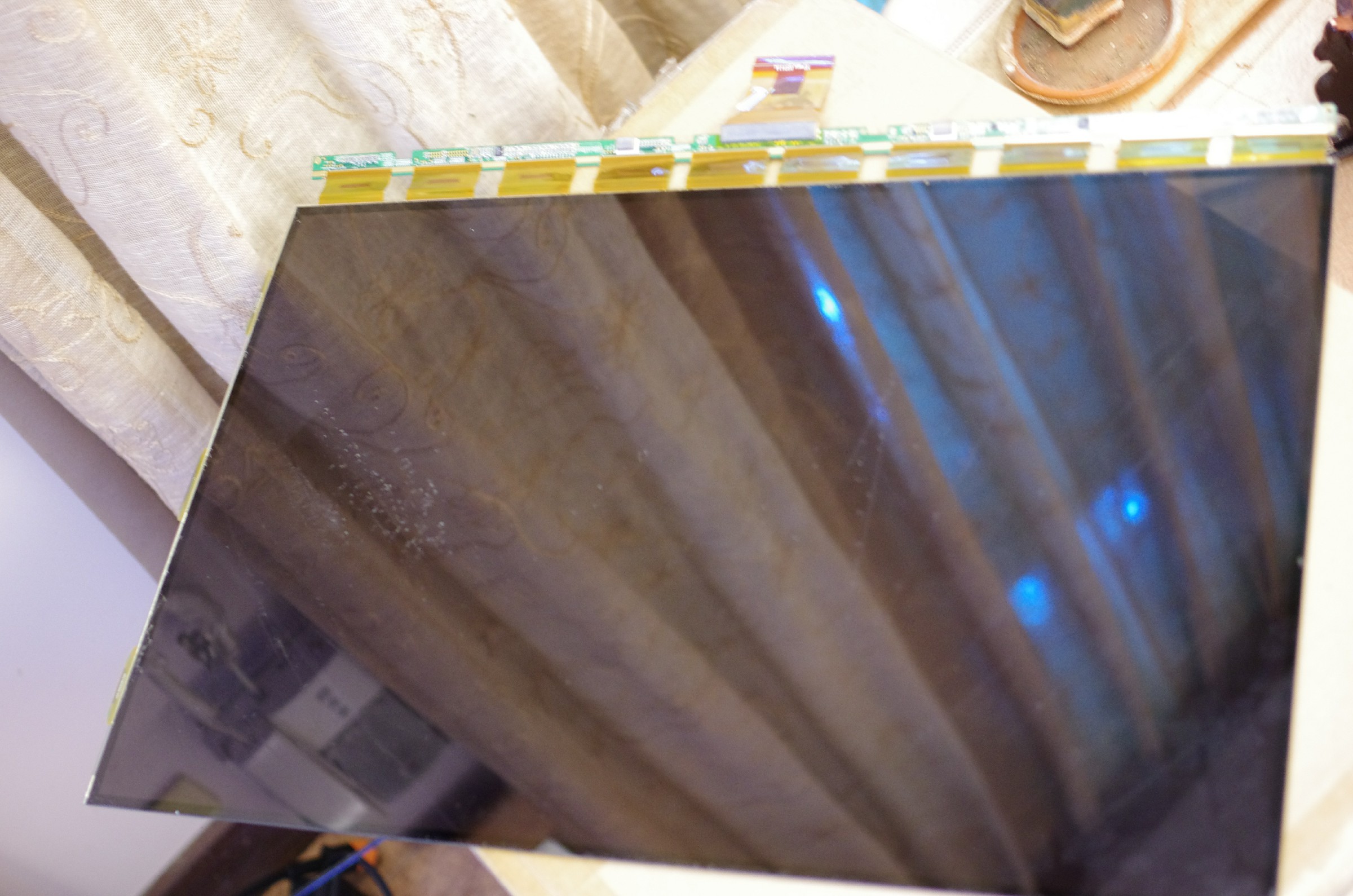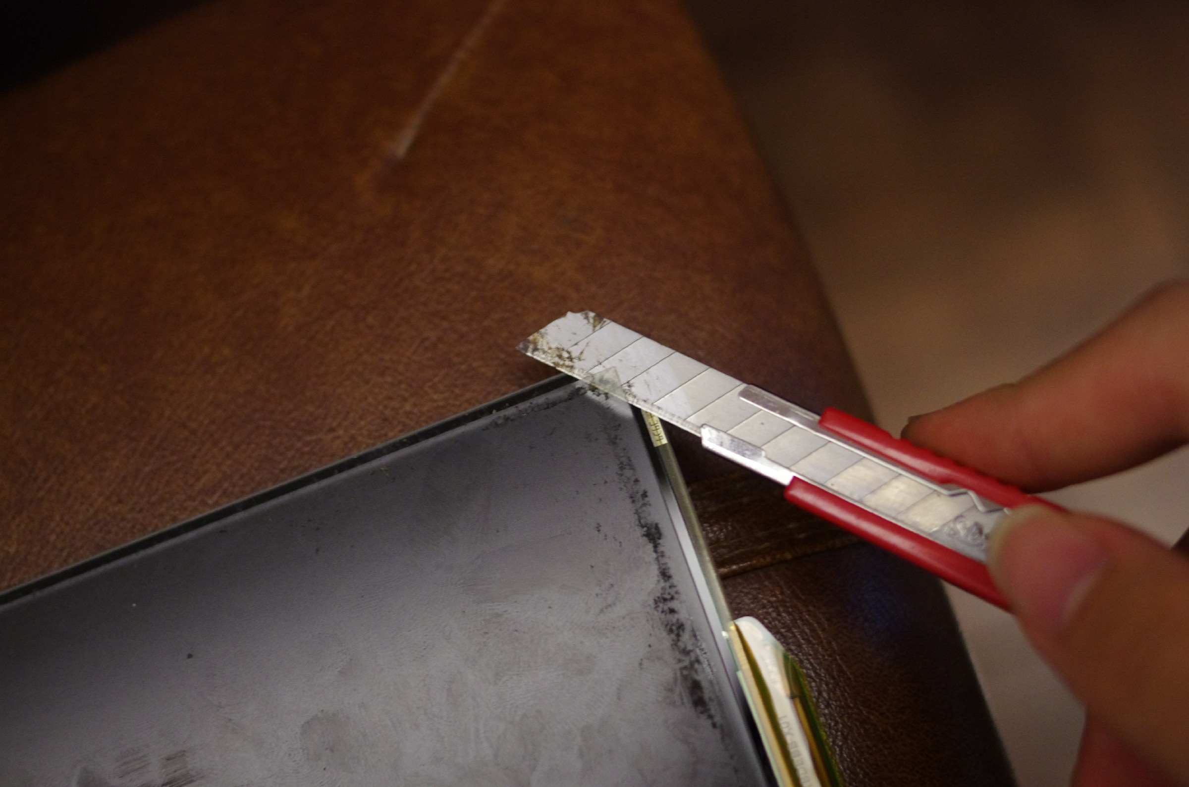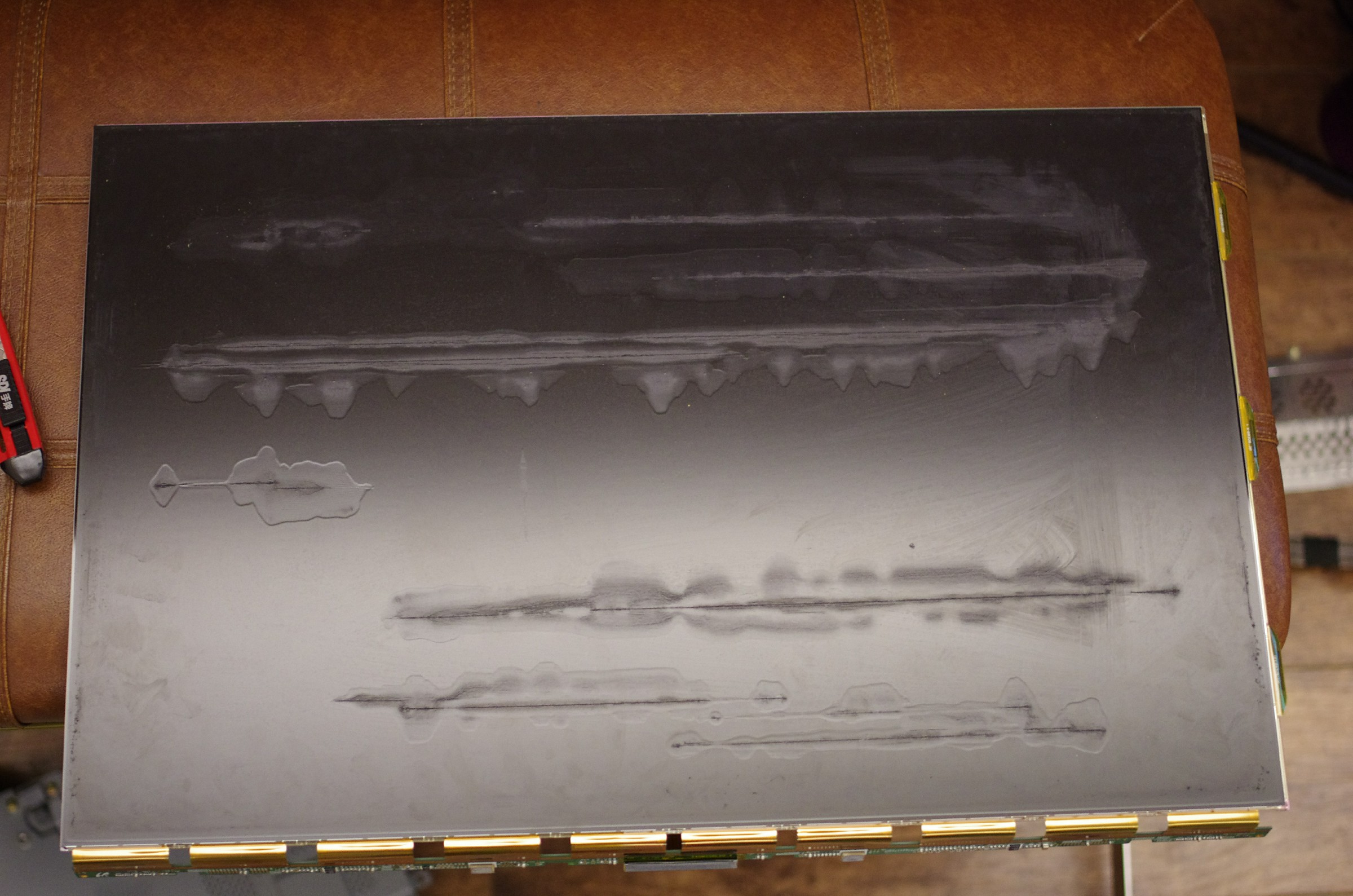 然後拆到剩下液晶部分時,就開始用刀從邊邊把偏光膜和液晶分開,然後撕掉,過程非常非常非常非常的臭,那個偏光膜不知道用什麼超級臭的膠黏的,搞的全屋子都是臭味。