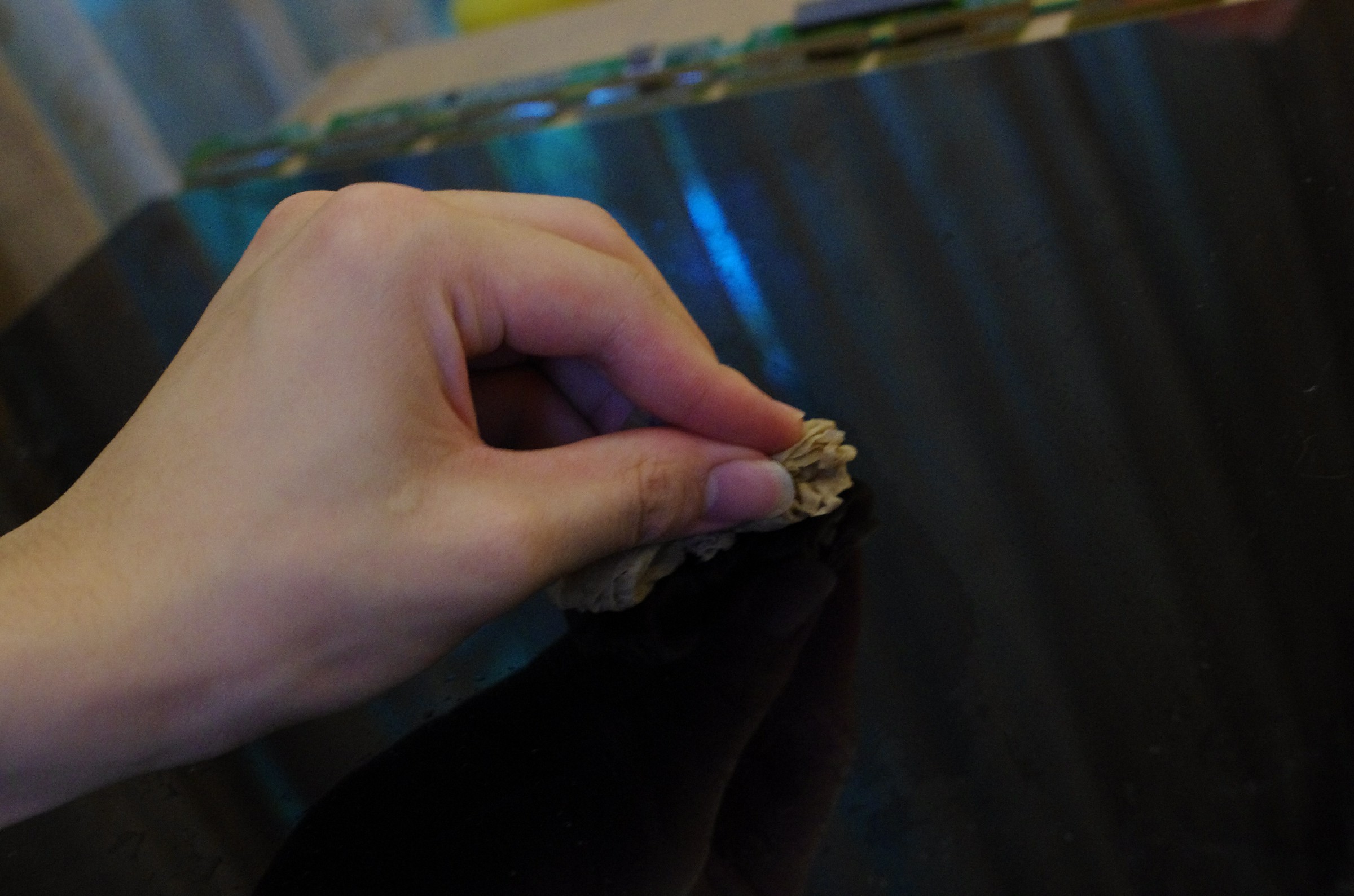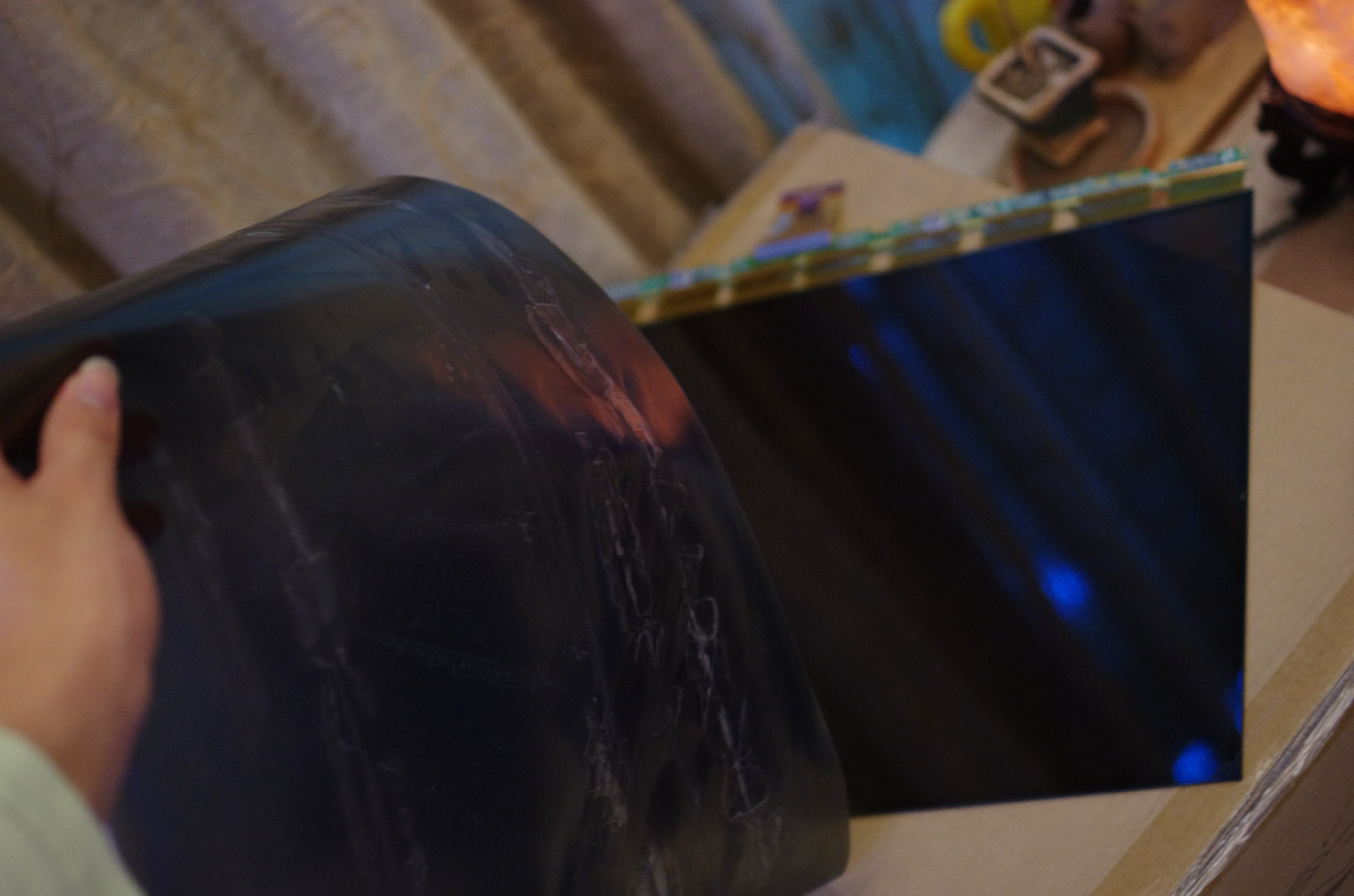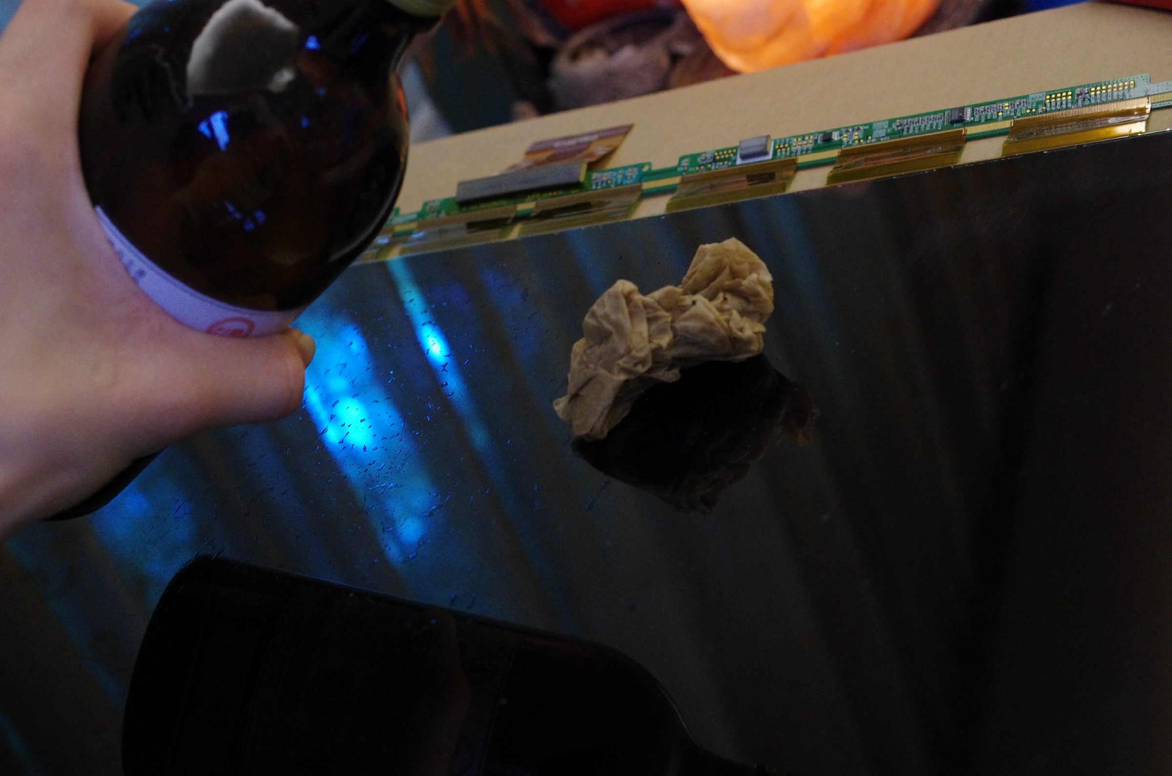 然後拆到剩下液晶部分時,就開始用刀從邊邊把偏光膜和液晶分開,然後撕掉,過程非常非常非常非常的臭,那個偏光膜不知道用什麼超級臭的膠黏的,搞的全屋子都是臭味。
