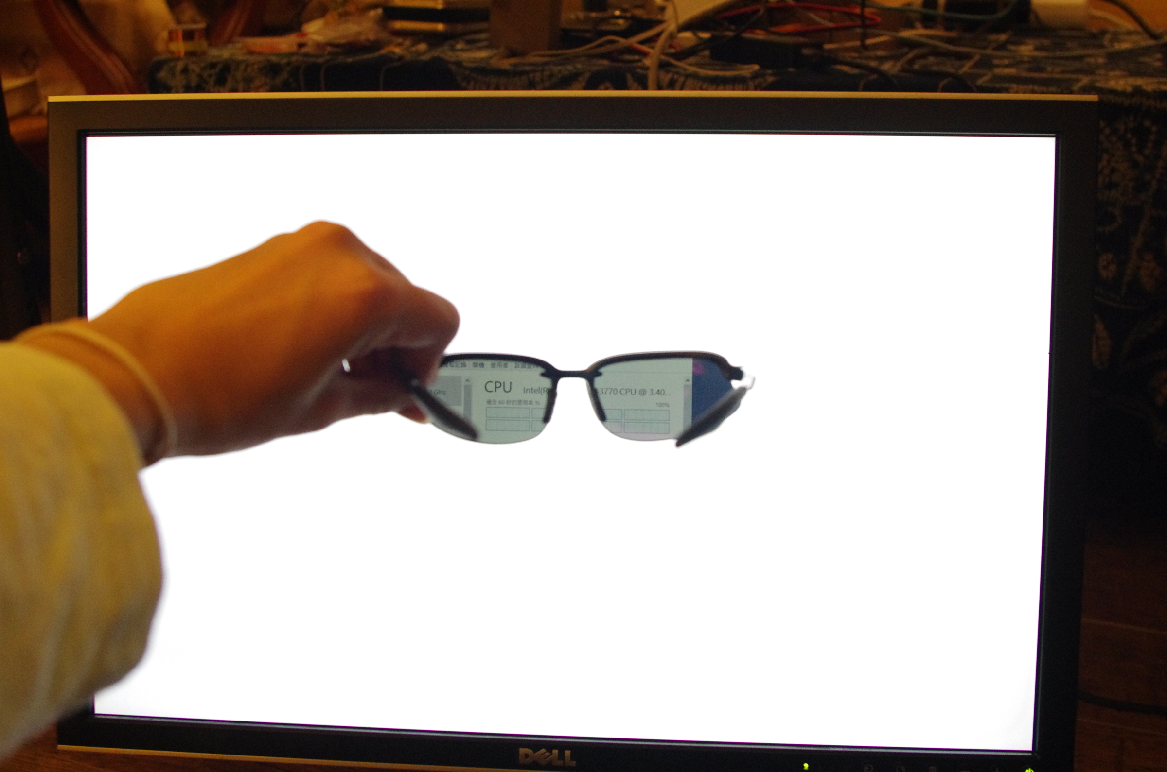 一個看起來完全白畫面的螢幕,但戴上有偏光效果的眼鏡時,就能正常看到顯示內容。